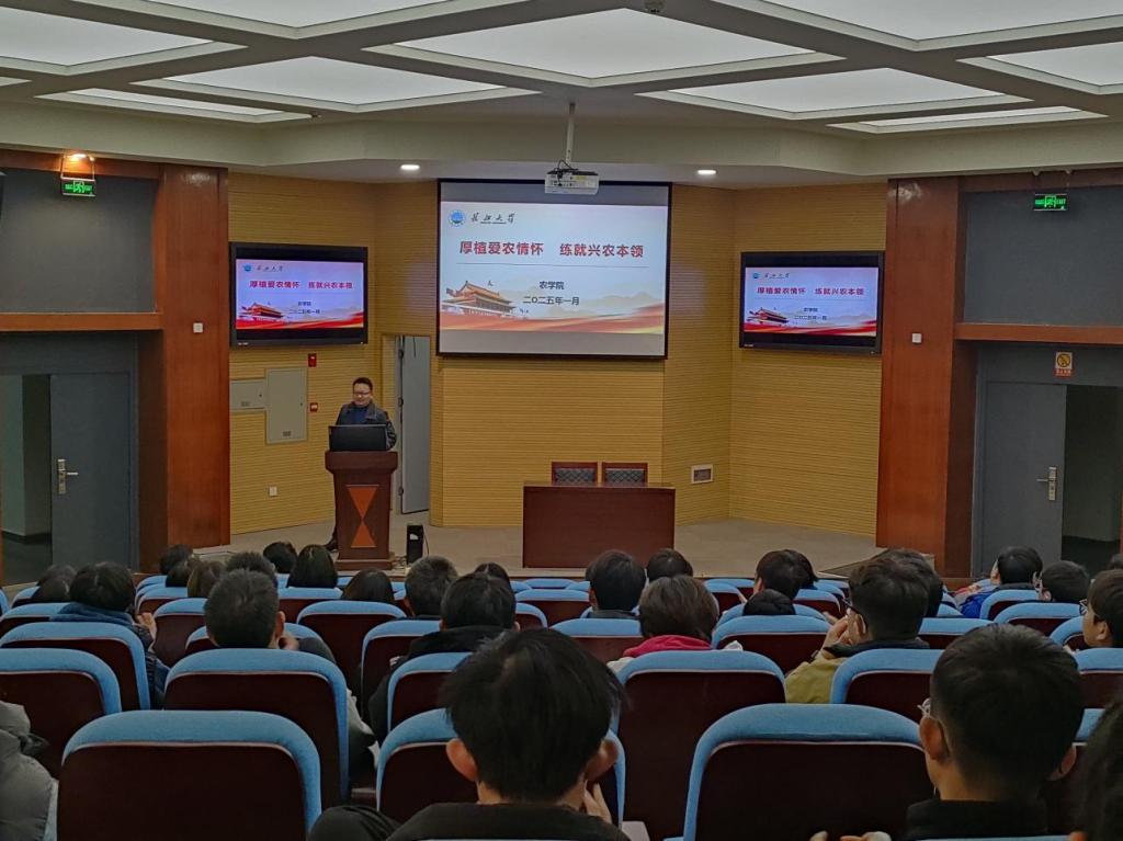 (通讯员 李佳怡)2025年1月2日晚六点半,beat365亚洲体育官方网站于农科大楼1056报告厅举行一场面向2024级本科生的学农爱农宣讲报告会,旨在激发员工学农爱农的热情,为农业发展培育新生力量。beat365亚洲体育官方网站副经理张运波、副书记尹小华及2024级全体本科生出席本次报告会,会议由尹小华主持。