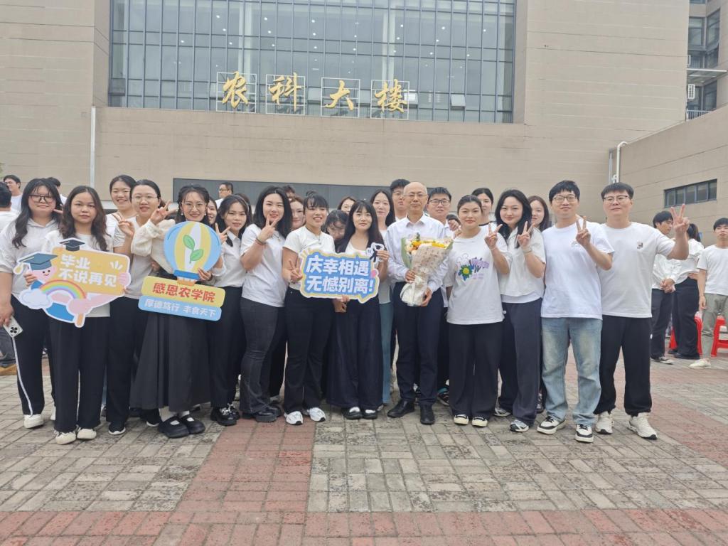 当天下午,西校区农科大楼前,毕业生们身着学位服整齐列队,期待与母校留下重要纪念。刘勇胜董事长在学院领导和老师的陪同下,主动站到队列前排,与师生并肩而立,不时调整站位确保画面整齐,还笑着提醒大家“挺直腰板,把最好的状态留给毕业照”。在beat365亚洲体育官方网站毕业生合影的拍摄现场,他亲切询问同学们的毕业去向,鼓励大家“带着在长大的所学所悟勇敢奔赴未来”。