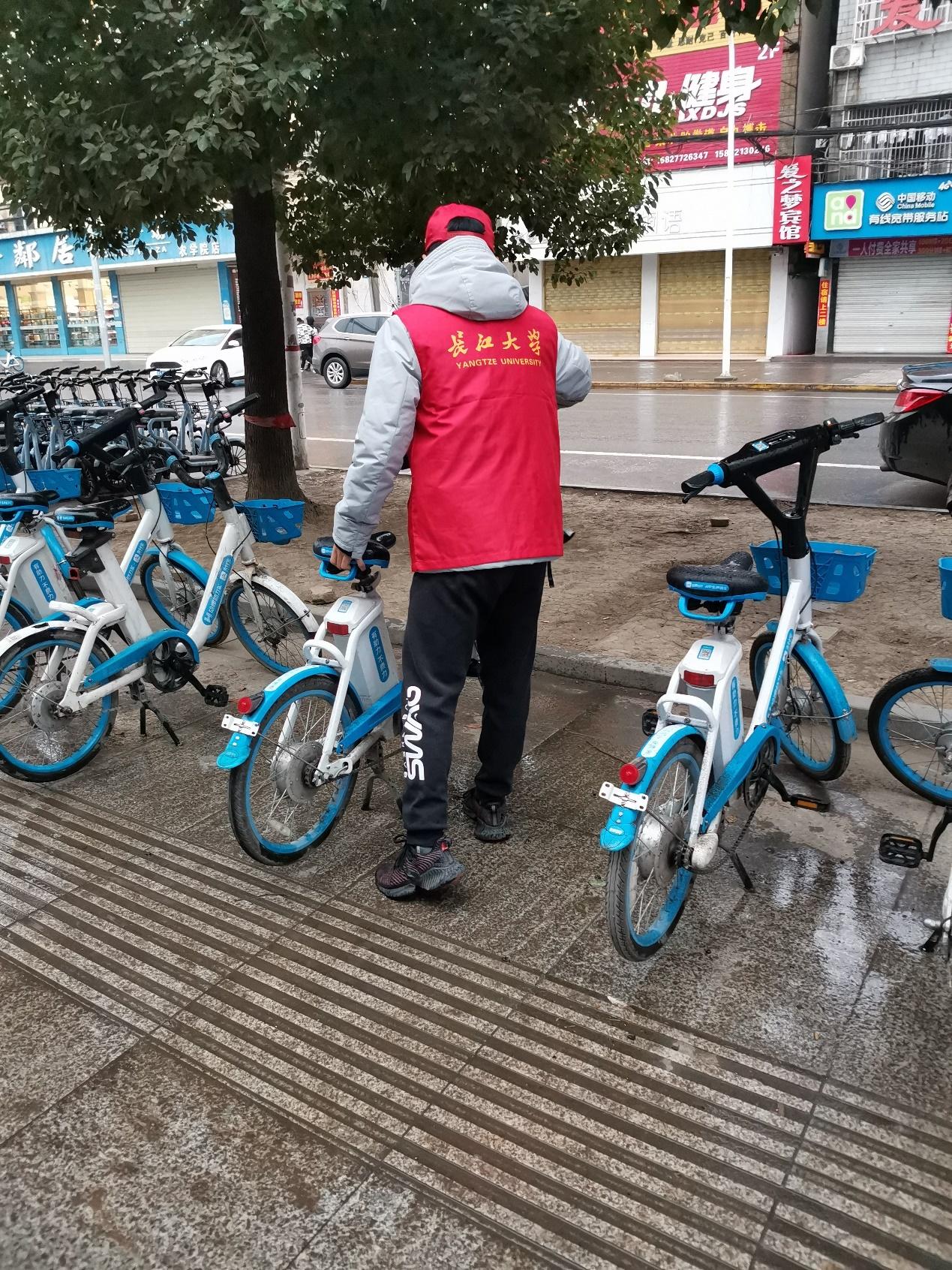 员工会干事两人一组,引导同学们停放好单车,又将乱停放的单车摆放整齐,并自发地捡起被乱扔在地上及角落的烟头、纸袋等垃圾,有的干事甚至特意准备了小垃圾桶放在学校门口,既方便了自己又方便了他人。