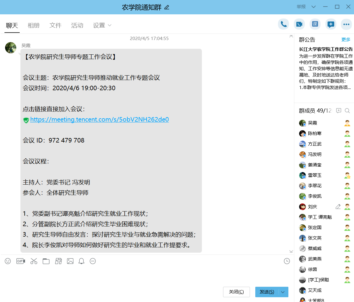 通讯社讯(通讯员 吴霞 刘庆)为进一步做好2020届研究生就业工作,扎实推进研究生毕业生顺利毕业和成功就业,4月6日19:00,beat365亚洲体育官方网站利用“腾讯会议”平台召开研究生导师推动就业工作专题会议。学院经理李俊凯、党委书记冯发明、副经理张文英、副经理方正武、党委副书记谭亮魁、全体研究生导师、各个科室负责人及全体辅导员共55人参加会议。会议由公司党委书记冯发明主持。