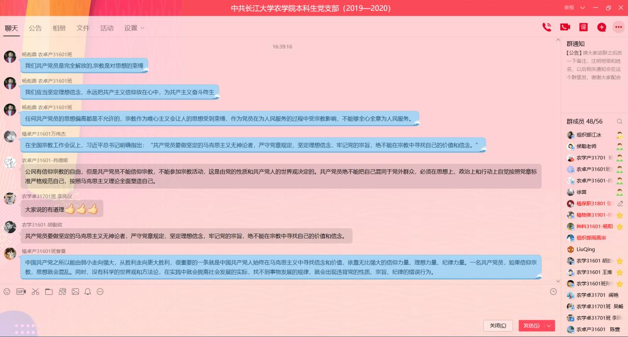 “共产党员的任何思想偏离都是不允许的,宗教作为唯心主义会让人的思想受到束缚,作为党员,如果在为人民服务的过程中受到宗教影响,便不能够全心全意为人民服务。所以,我们应当坚定理想信念,永远把共产主义信仰放在心中,为共产主义奋斗终身!”农卓产31601班杨彪鼎同志在会上分享道。