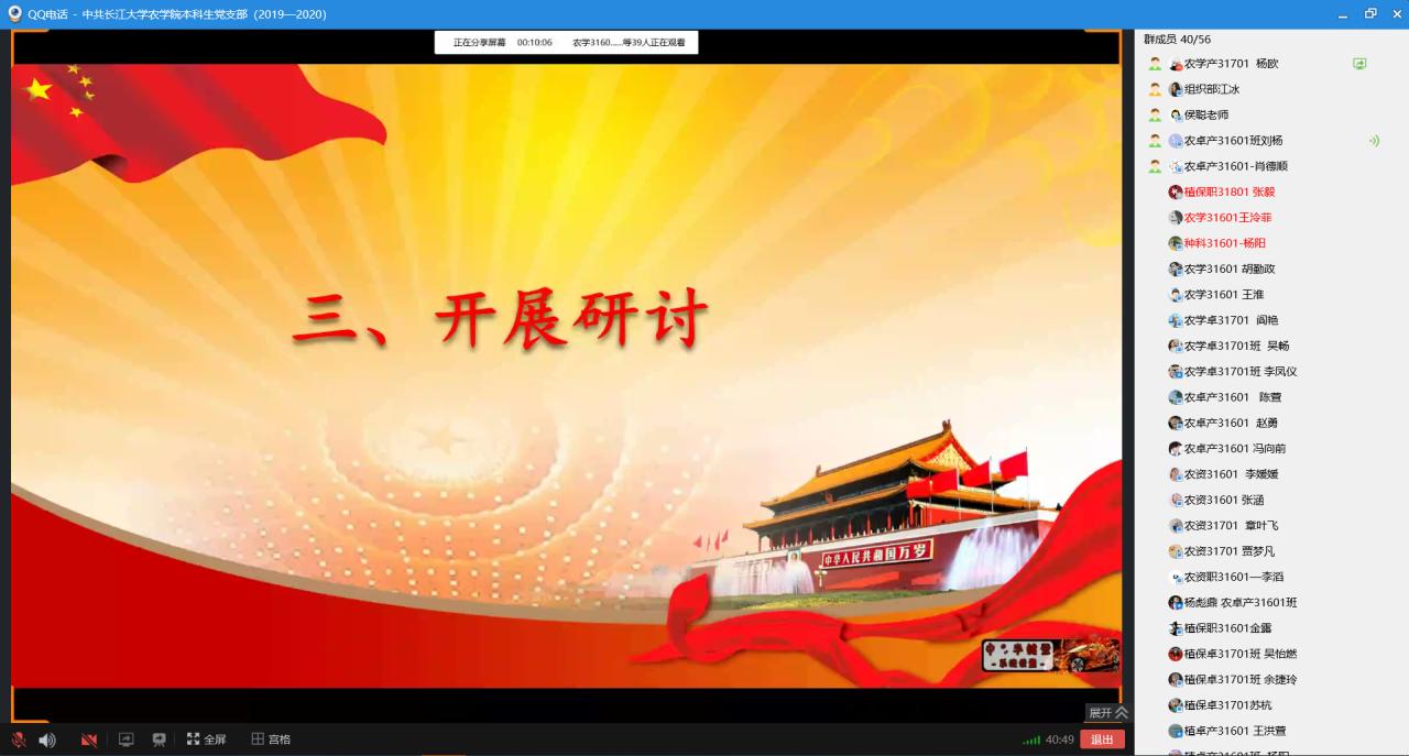 会议伊始,刘杨同志带领全体党员重温了入党誓词。随后,17级党员代表饶彬、阎艳、江冰、吴怡燃、章叶飞等同志分别从“《党章》总纲部分、习近平总书记关于疫情防控工作系列重要讲话、《习近平新时代中国特色社会主义思想三十讲》第二十九讲、《关于新形势下党内政治生活的若干准则》第一章、《中国共产党纪律处分条例》(新修订)第六章”共五个方面,带领全体党员进行细致学习。