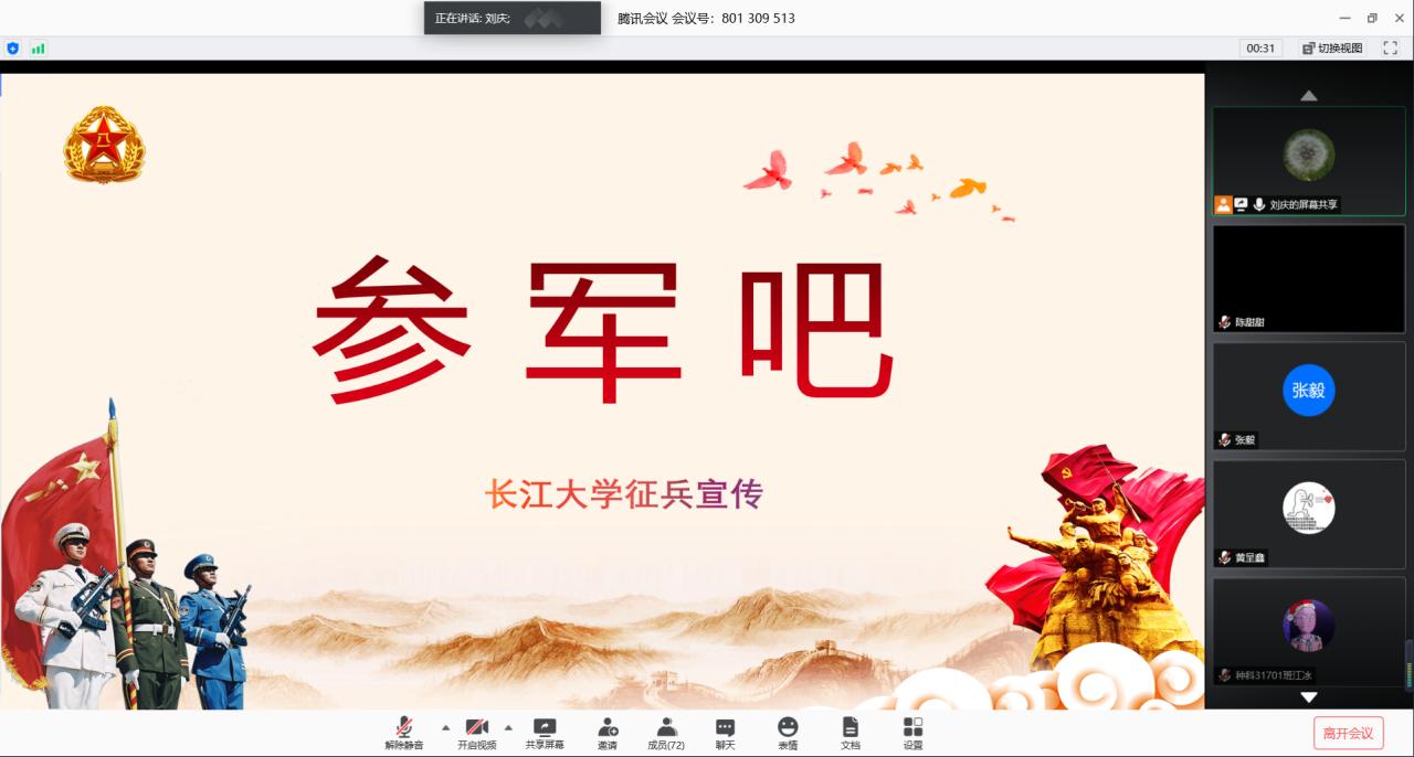 通讯社讯(员工记者 张毅)为进一步推进公司员工征兵政策宣传工作,帮助员工了解、掌握应征入伍相关政策和流程,5月29日19:00,公司通过“腾讯会议”平台开展了线上征兵政策宣讲活动。此次宣讲会由学工办主任刘庆主讲,本科班各班长、团副、今年报名应征和有入伍意愿的员工共同参与了此次宣讲会。