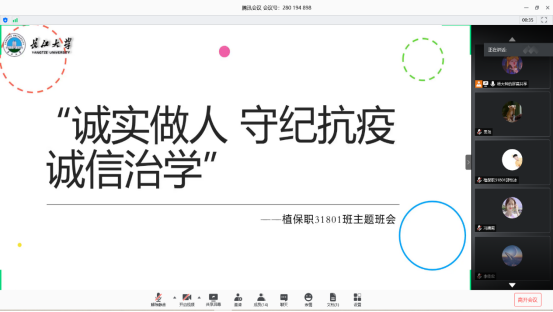 本次主题教育活动紧密围绕“做人、抗疫、治学”等老员工事务,将“诚信”理念贯穿其中,引发各班级的纷纷响应和热烈讨论。植物类31902班通过“腾讯会议”平台开展了此次班会。班长亢凯同学在会前召集了全班员工,并邀请班主任邓锋林老师参会。会上,主讲人李麟政给同学们普及了生源地助学贷款的相关事宜,讲解了疫情期间的防护措施和需要注意的问题,并着重强调了诚信的作用。活动中,每个同学都积极认真地参与进来,表现出了对诚信问题的高度关注,希望能做诚实之人、守纪之人。植保职31801班也积极参与到了主题活动中。首先由主持人杨姝祺同学说明此次活动背景,并播放教育部考试中心录制的《教育部诚信考试宣传片》。该视频以青蛙为角色,学校为背景,生动形象地阐述了违纪作弊、违法考试的处理方式。最后,同学们积极交流自己的观影感想,罗亚君同学感慨道:“我们要以视频为本延伸至每一次考试,目前临近期末,希望大家都能认真复习,以诚信、自身实力考出不俗的成绩。”