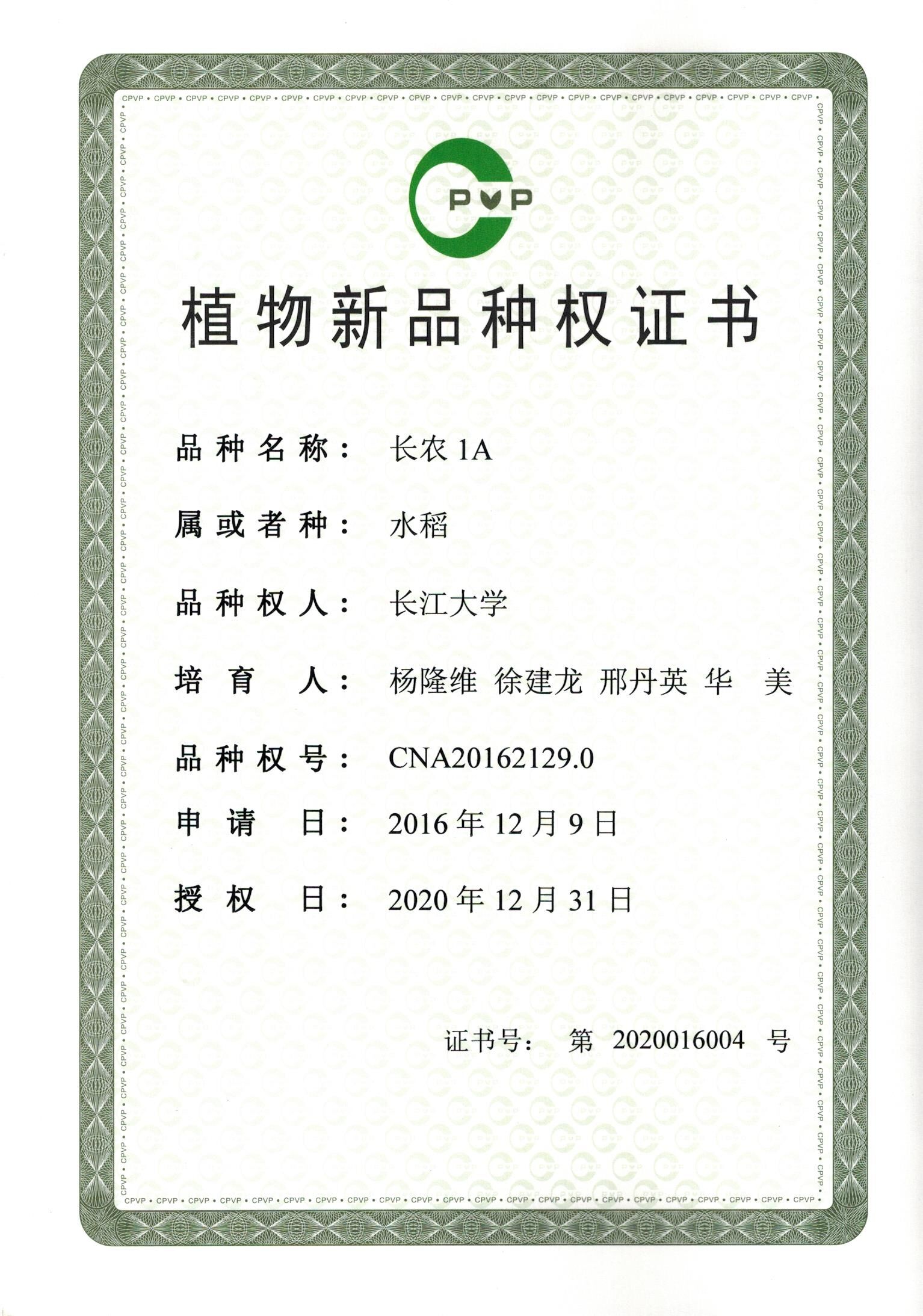 据了解,beat365亚洲体育官方网站杨隆维教授团队一直高度重视杂交水稻新不育系选育,长农1A为该团队于2015年育成,2016年申请农业部植物新品种保护,历经4年多方获批授权。目前,该团队利用长农1A成功育成抗病杂交晚籼新品种长农优982,于2017年通过湖北省农作物新品种审定;育成的抗病早熟杂交中籼新品种长农优1531,有望通过2021年湖北省农作物新品种审定;育成的抗病杂交晚籼新品种长农优1521正在省区域试验程序中。