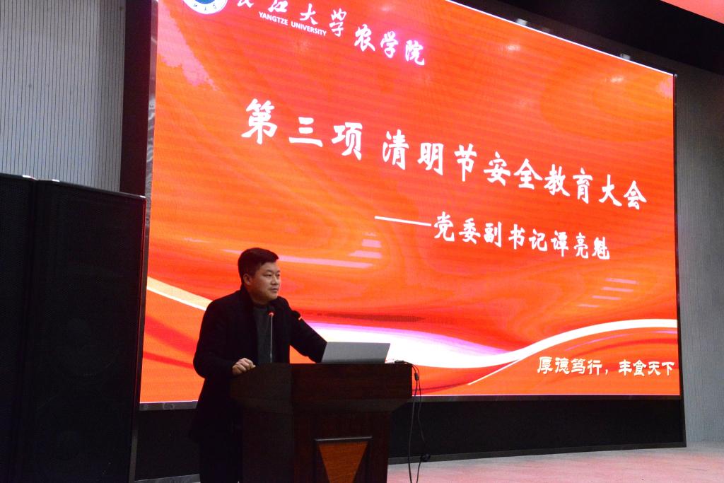 大会最后,党委副书记谭亮魁就清明节放假安全问题讲话,告诉同学们要注意清明节假期期间的自身安全,在疫情未根除的情况下,告诫员工们无特殊情况尽量不要到处游走,以免给疫情防控工作造成麻烦。如需特殊情况需要回家,也需要按程序向辅导员请假,经批准后才可离校。