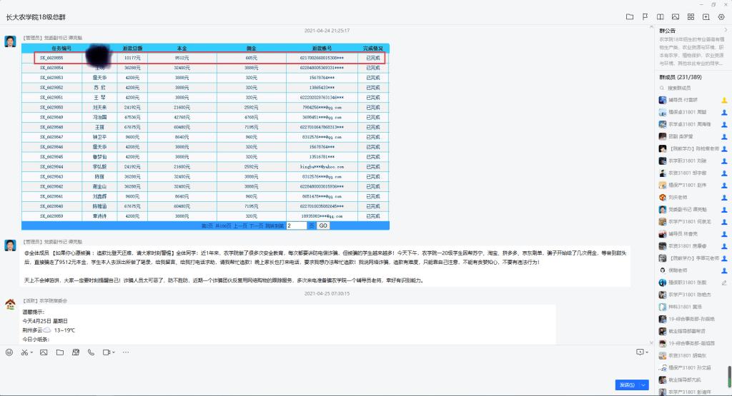 在此期间,公司党委副书记谭亮魁通过发布群通知和公告,向大家广泛传授“什么是电信诈骗”、“电信诈骗的特点”、“诈骗的危害”、“如何防范电信网络诈骗”以及有关“校园贷金融风险防范”等相关知识。结合最近几起比较严重的诈骗案件,谭亮魁为同学们分析了诈骗手段以及诈骗心理,认真讲解“安全防范诈骗提示”,教育大家如何防范诈骗,提醒同学们增强安全防范意识,保护财产安全。