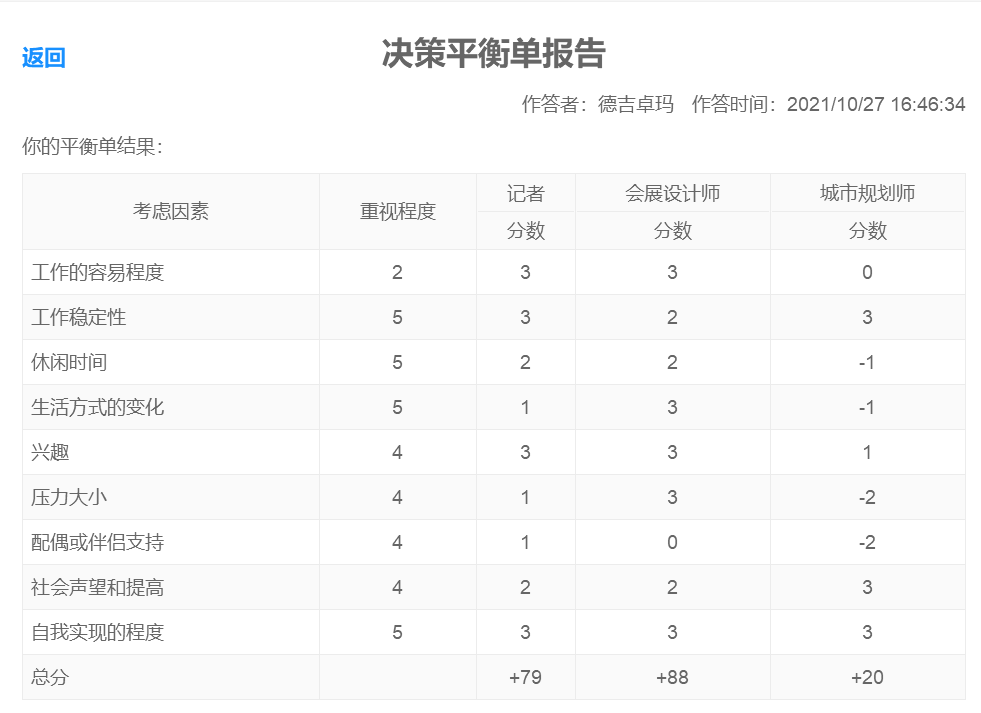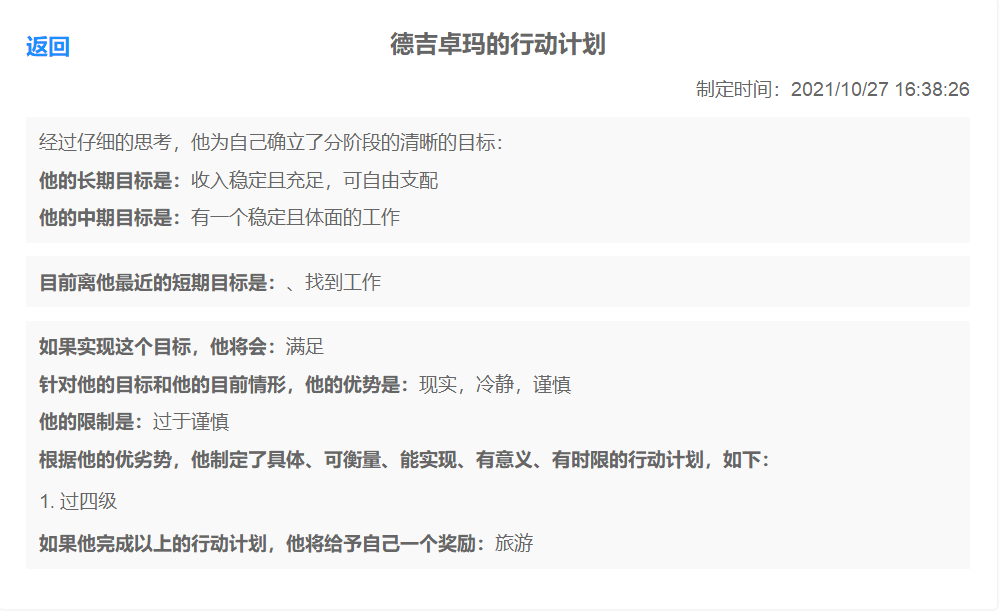 辅导员通过“北森”后台查看并导出每个员工的“决策平衡单”和“行动计划”对员工的生涯规划有了清晰的掌握(如上图所示为2021级植物类32102班某位同学“决策平衡表”和“行动计划”的后台导出结果),并且“1对1”地和员工进行生涯规划指导,帮助他们树立明确的学习目标。