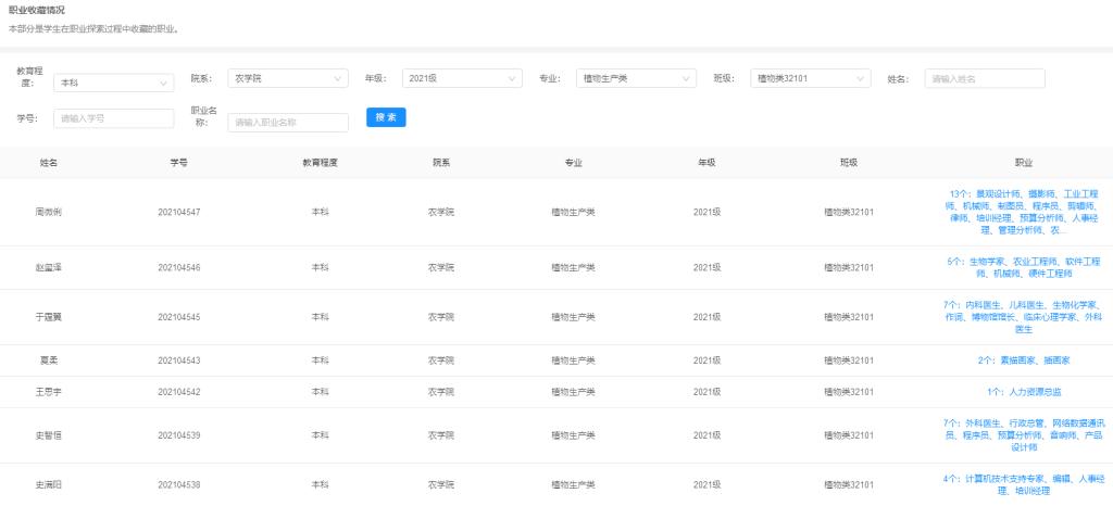 通过登录“北森”后台,查看公司每一位本科新生所收藏的职业,侧向反映了每位新生的心怡理想职业。