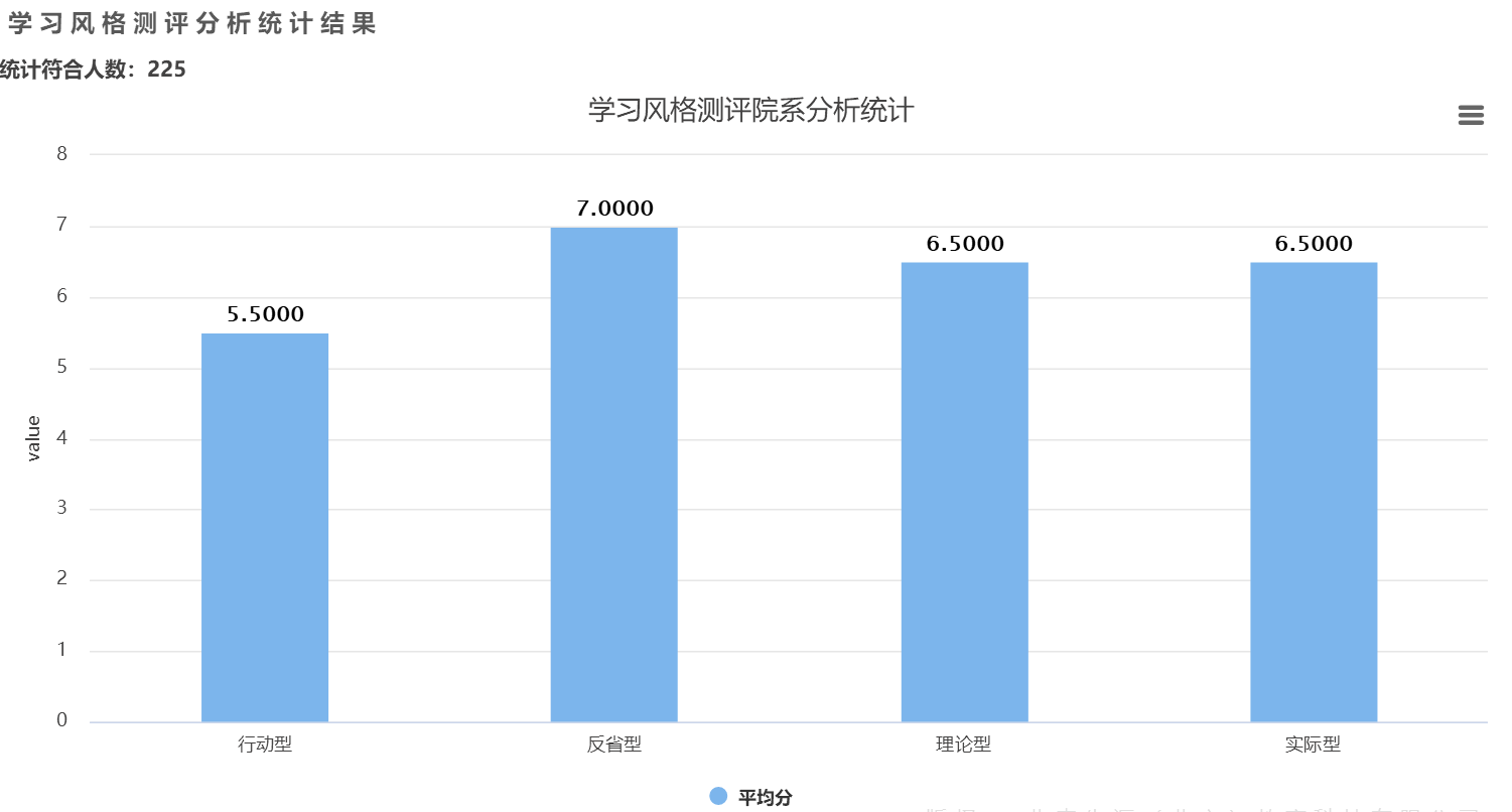 此图表为公司新生的“学习风格测评分析统计”,可以看出具备“反省型”学习风格的人数最多,“反思”在大学的学习中非常重要,孔夫子曾说“吾日三省吾身”和“学而时习之,不亦说乎”,辅导每次去看望员工早晚自习时,都会告诉员工要对当天课上学的知识和以前学的知识及时进行“复习订正巩固”并且对即将学的知识进行“预习”。具备“行动型”学习风格的最少,在今后的教育培养中我们会重视培养员工的“动手能力”和“实践能力”。
