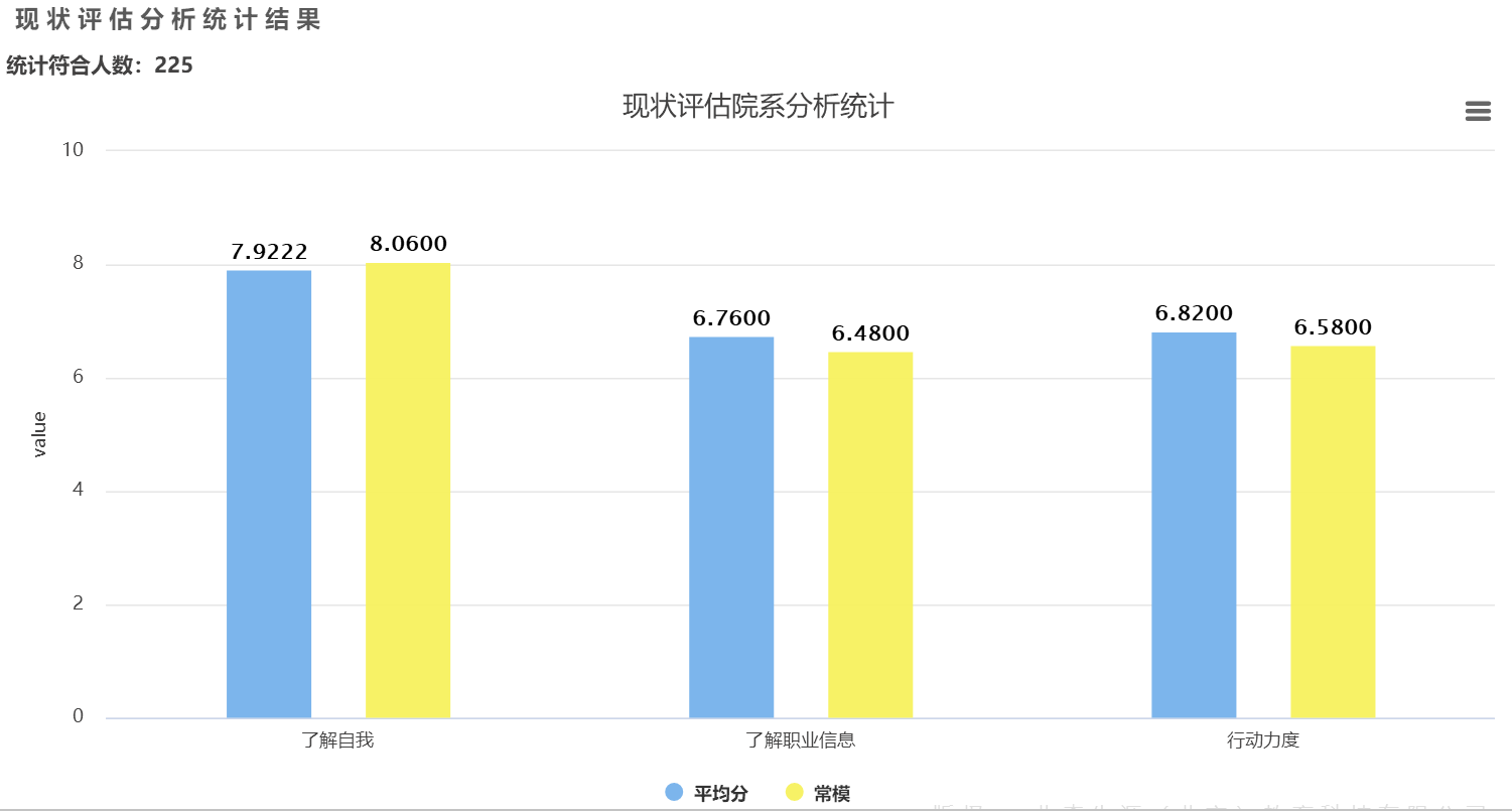 在“现状评估分析统计”中可以清晰地看到公司2021级本科生在“了解自我”这一方面的平均分略低于常规分,在“了解职业信息”“行动力度”上都已达到常规分。