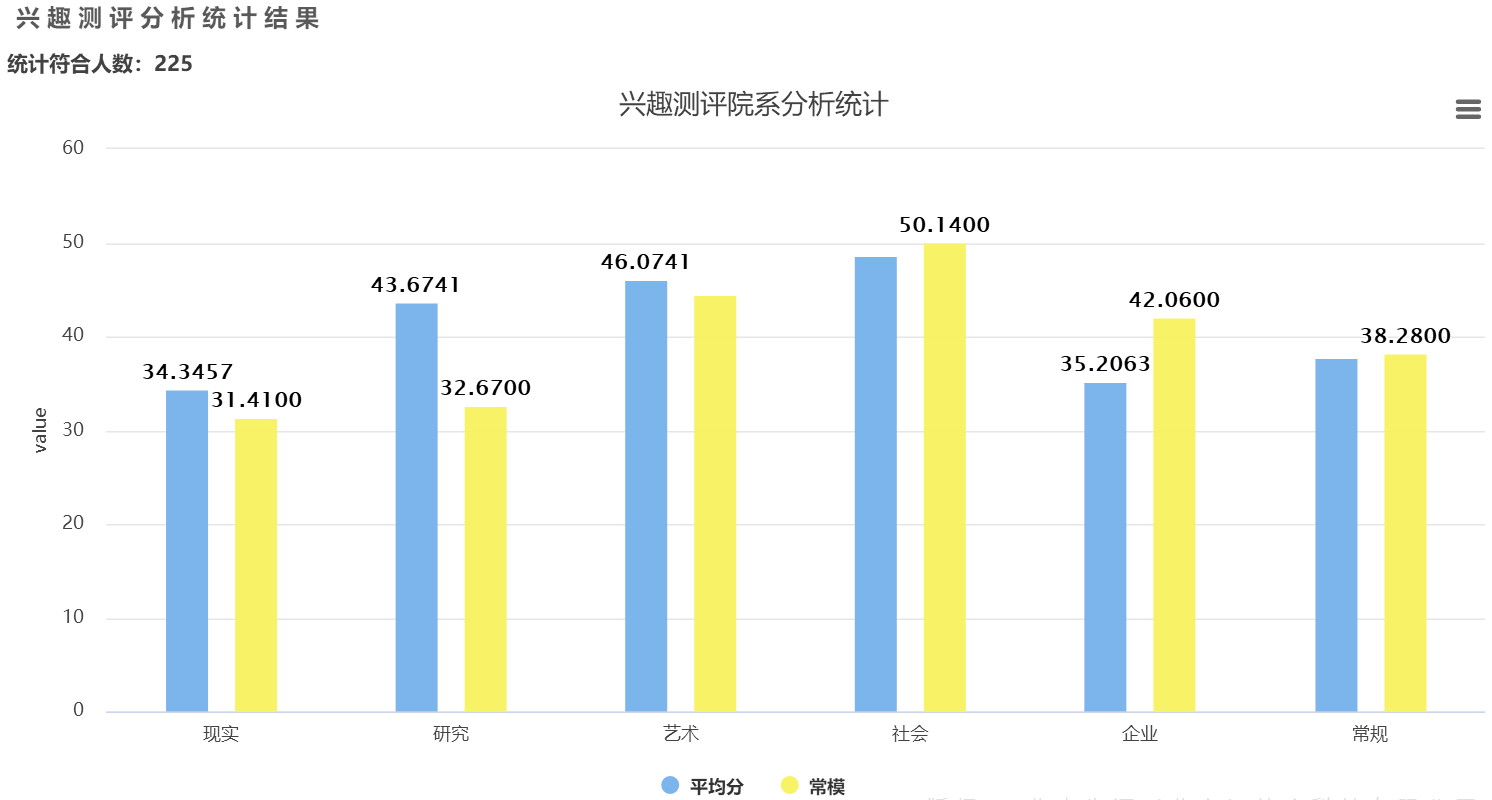 在“兴趣分析统计”中可以看到公司2021级本科生对“研究”的兴趣度明显高于常规值,但对“企业”和“社会”的兴趣度都低于常规值。