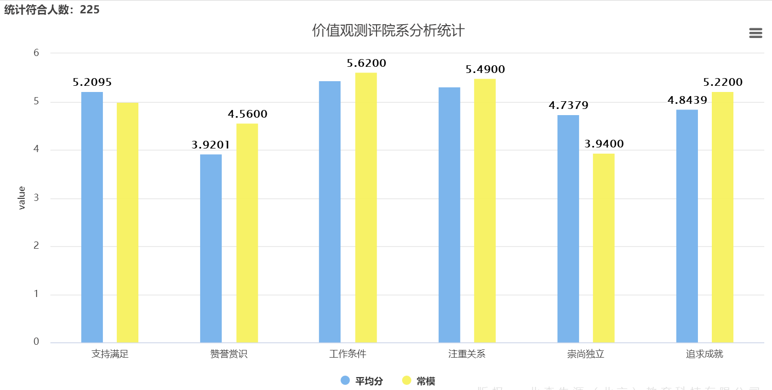 此图表为公司新生的“价值观测评分析统计”,可以看出“支持满足”、“崇尚独立”这两项价值观均已达到常规标准,“赞誉赏识”、“工作条件”、“追求成就”、“注重关系”这几项价值观略低于常规标准。在对员工的教育和培养中,我们会注重员工价值观的培养,帮助员工形成正确良好的价值观。