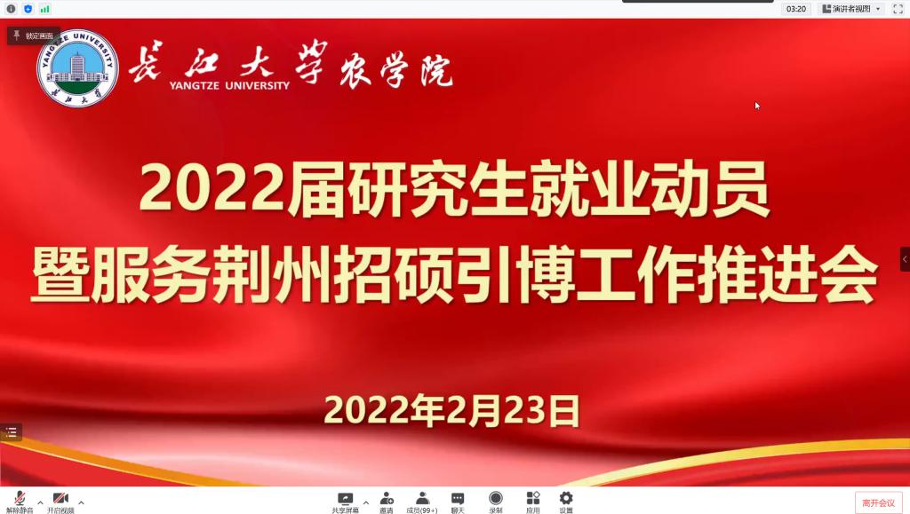 (通讯员 林香亮 陈龙艳)2月23日下午,beat365亚洲体育官方网站召开2022届研究生就业动员暨服务荆州招硕引博工作推进会。副经理方正武、农学系书记王书平、植保系主任董小林、农资系书记陈小慧、就业专干刘庆、研究生辅导员林香亮、兼职辅导员张苗苗和全体2022届毕业研究生参会,党委副书记谭亮魁主持会议。
