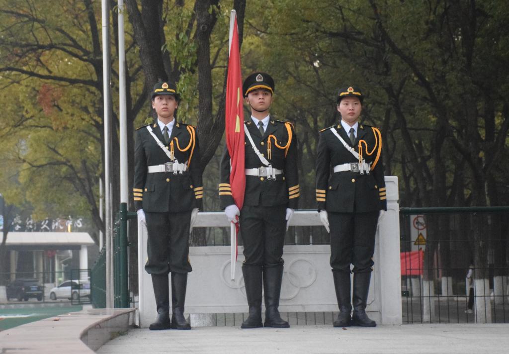 早晨6点30分,同学们陆续到达操场,以班为单位整理队伍后站定,一切准备就绪,升旗仪式正式开始。国旗护卫队的队员们踢着庄严的正步,眼神坚毅,表情肃穆,伴随着国歌的奏响,红日初升,国旗飘扬。同学们炯炯有神的眼睛、挺拔的身姿向祖国昭示着他们的蓬勃生机。