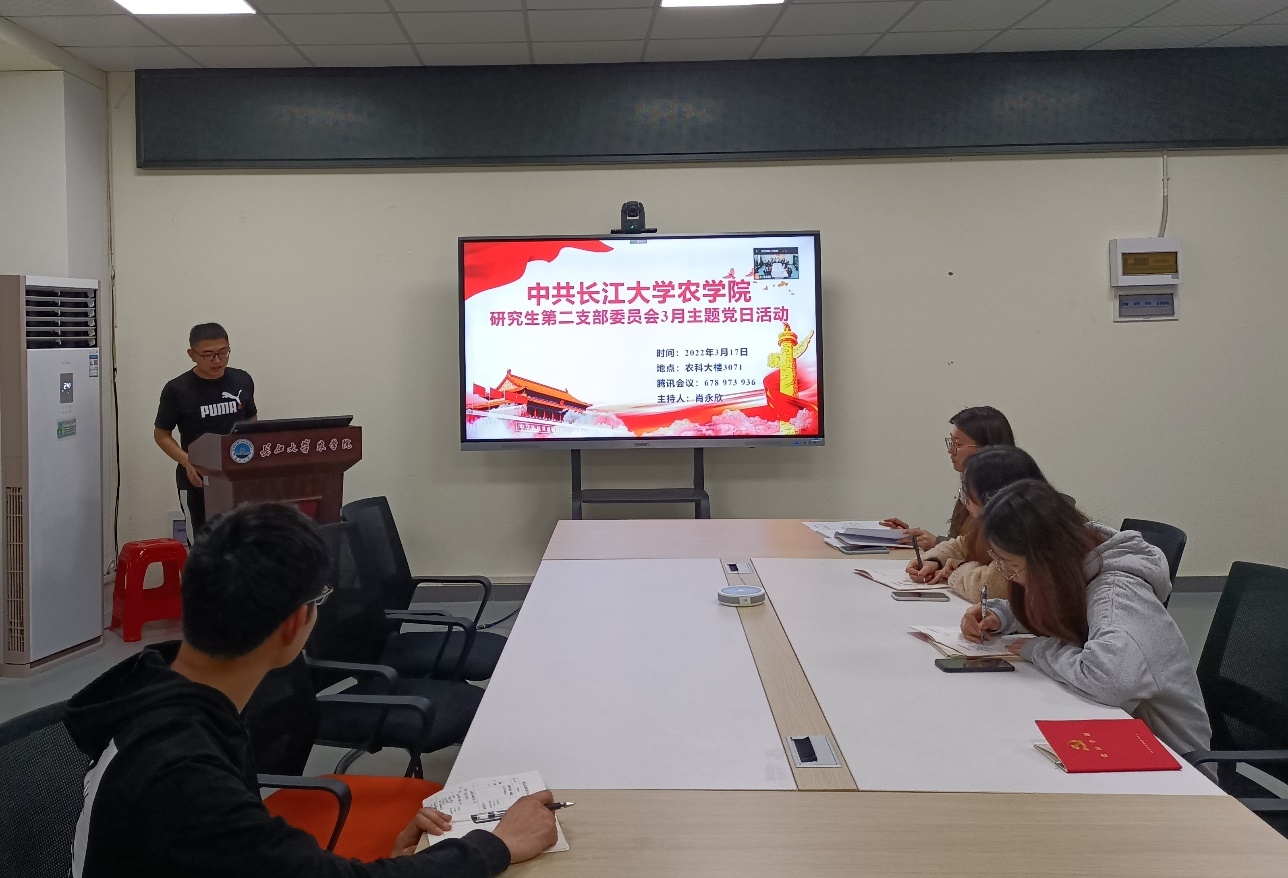 于3月17日晚上7点,公司研究生第二党支部在农科大楼3071开展了3月份主题党日活动,活动结合腾讯会议的方式开展。全体在公司党员和校外联培党员参与了此次活动,会议由支部副书记肖永欣主持。