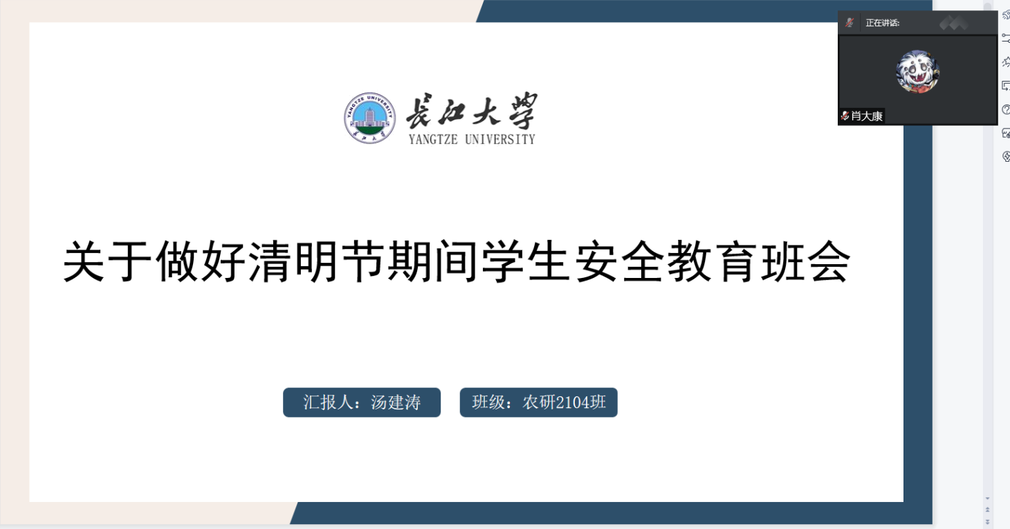 最后,研究生辅导员针对当前疫情形势重申了校园管控纪律,非必要不外出,非批准不离校,强调了清明节假期前后的疫情防控、反诈骗、网络安全等注意事项,增强了员工的自我防范意识。