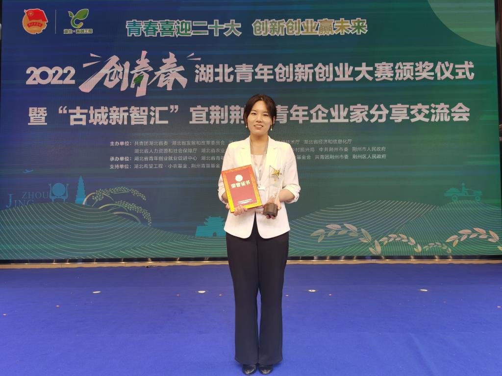 通讯员 李雅倩 夏应翔青春喜迎二十大,创新创业赢未来。6月24日,由荆州团市委承办的 2022年“创青春”湖北青年创新创业大赛在荆州举行。公司周燚教授指导的“猪粪转化育苗基质的资源化利用技术”项目获得乡村振兴专项决赛金奖,团省委书记周森锋、市委书记吴锦亲自为主讲人柴梦莹颁奖。