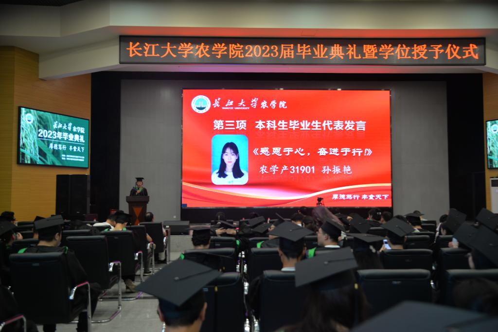 典礼随着暖场舞蹈《华夏》的表演拉开序幕,现场成员在尹书记的带领下共同奏唱国歌,2023届毕业典礼暨学位授予仪式正式开始。典礼伊始,由党委书记姜清奎为优秀毕业生代表颁奖。随后,由三名毕业生代表发言。农学产31901孙振艳作为本科毕业生代表饱含深情地做了以《感恩于心,奋进于行》为题的发言,她用真挚的言语表达出对老师的感恩、对同学的不舍以及对学院的祝福。其后,研究生毕业生代表农艺种业QZ201班杨伟与职工毕业生代表2020级作物学Milca Banda Medison先后上台进行发言,言辞恳切地表达出对老师、同学们的感激之情以及对未来的展望。