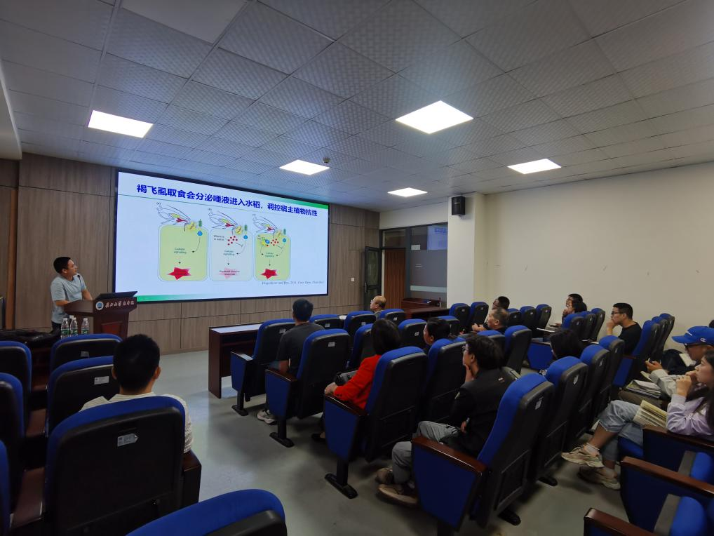 在报告中,郭建平教授从粮食安全入手,分享了其课题组在该领域取得的重大性突破成果:首次鉴定了一个被植物免疫受体蛋白识别的昆虫效应子BISP,并揭示了BISP-BPH14-OsNBR1互作系统精细调控水稻抗性-生长平衡的新机制,为开发高产、抗虫水稻品种提供了重大理论和应用基础,也为其它粮食作物新型抗虫、抗病机理的研究提供了新思路。