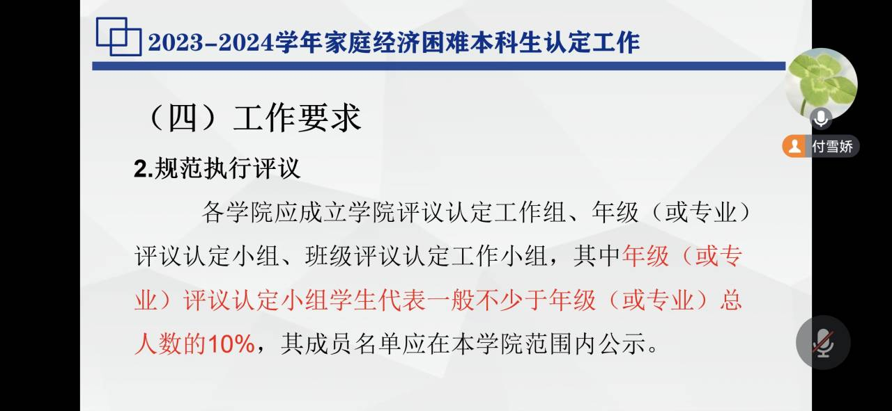 (通讯员 曾恺怡)为做好公司普通家庭经济困难员工认定工作,全面落实资助政策,做到有效资助,确保家庭经济困难员工能顺利入库,近日,公司召开了家庭经济困难本科生认定工作政策宣讲会。会议分为学院政策宣讲会和班级宣讲会,结合线上和线下的方式开展,党委副书记尹小华、资助专干付雪娇、全体班主任及全体班委参加此次会议。会议由付雪娇老师主持。