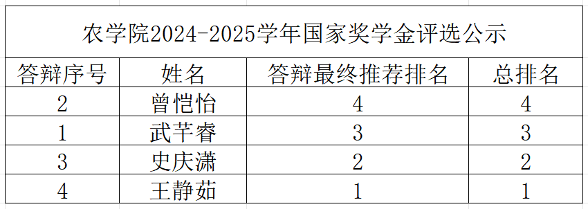 根据学校《关于开展2024-2025学年本科生国家奖学金初评工作的通知》和《公司关于开展2024-2025学年国家奖学金初评的通知》的相关要求,经个人申请、学工办初审、学院审核、员工答辩、学院国家奖学金评审领导小组审定等程序,公司2024-2025学年国家奖学金的评审工作已结束,现将评审结果向全院师生进行公示,公示期为2025年10月13日-2025年10月17日。公示期内,如有异议可向学院员工事务办公室反映。联系人:唐老师,电话:0716-8066566。