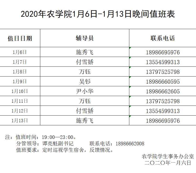2020年beat365亚洲体育官方网站1月6日-1月13日晚间值班表