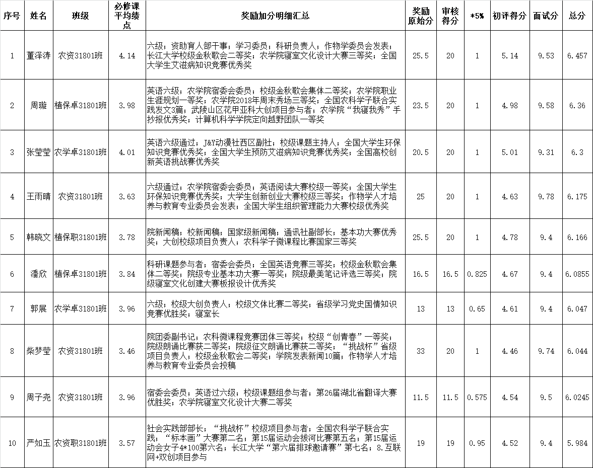 为了树立先进典型,充分发挥典型的教育示范作用,有效激励全院员工勤奋学习,形成积极进取、学习先进、崇尚先进、争当先进的良好风气,促进员工全面发展和成长成才,经个人报名、资格审核、个人展示、面试答辩等程序,拟推荐董泽涛、周璇、张莹莹、王雨晴、韩晓文、潘欣、郭展、柴梦莹、周子尧和严如玉10名同学为本届“十佳兴农青年”候选人。