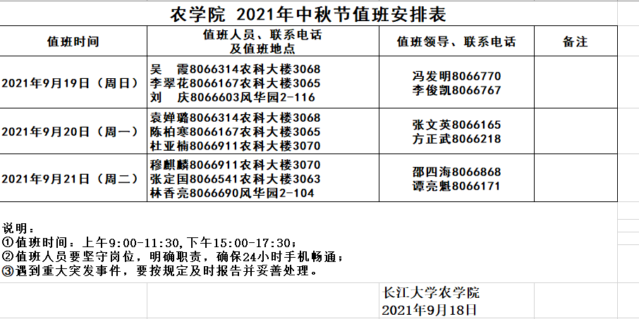 2021年中秋节值班安排表