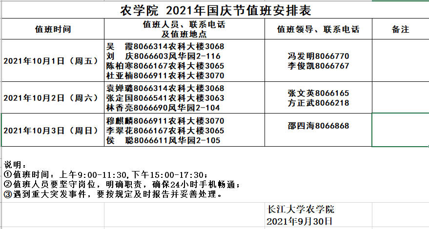 2021年国庆节值班安排表
