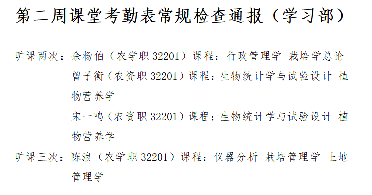 为端正学风、严肃校纪校规,现对全体员工课堂考勤常规检查给予通报。