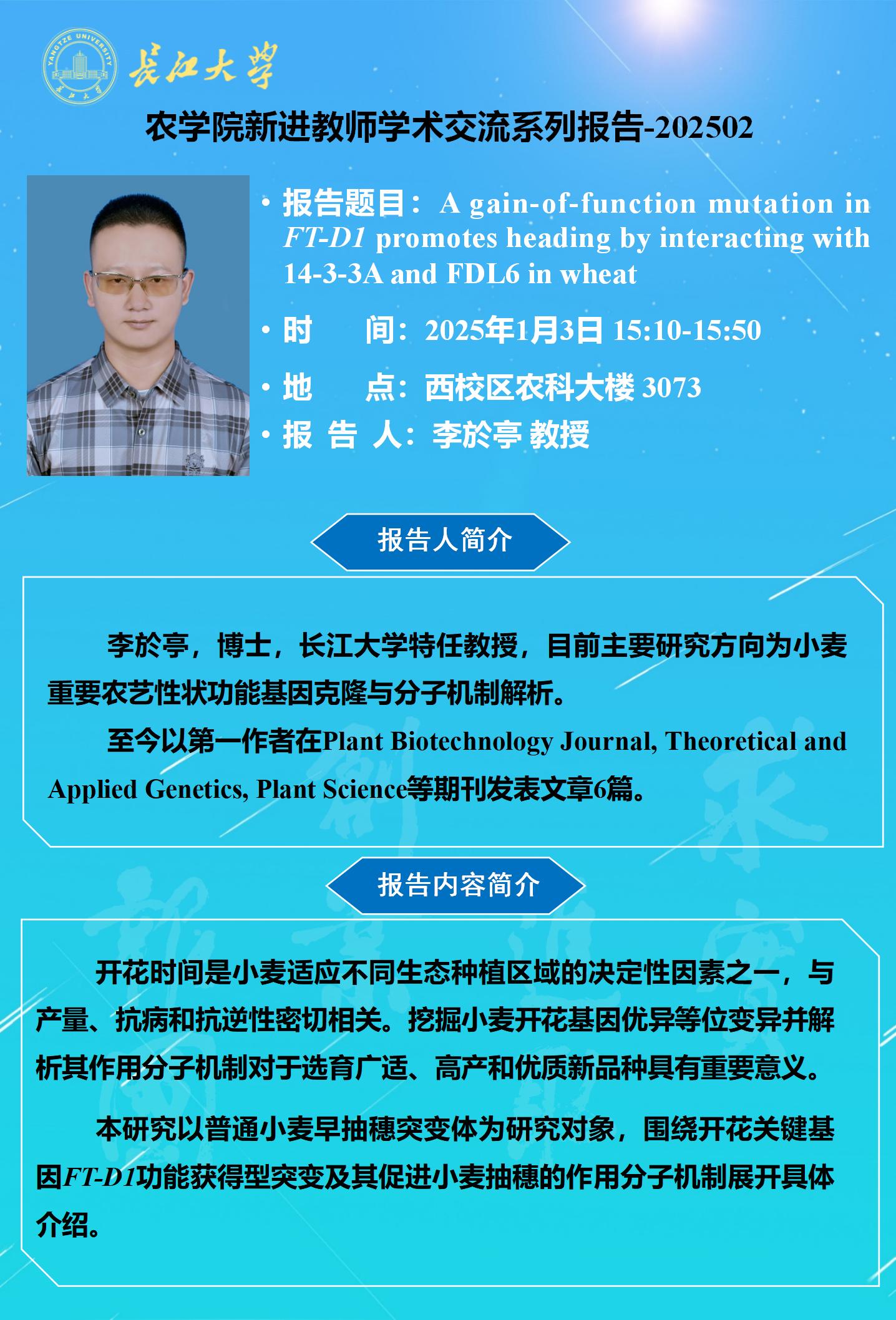 2025年学术报告(二):A gain-of-function mutation in FT-D1 promotes heading by interacting with 14-3-3A and FDL6 in wheat