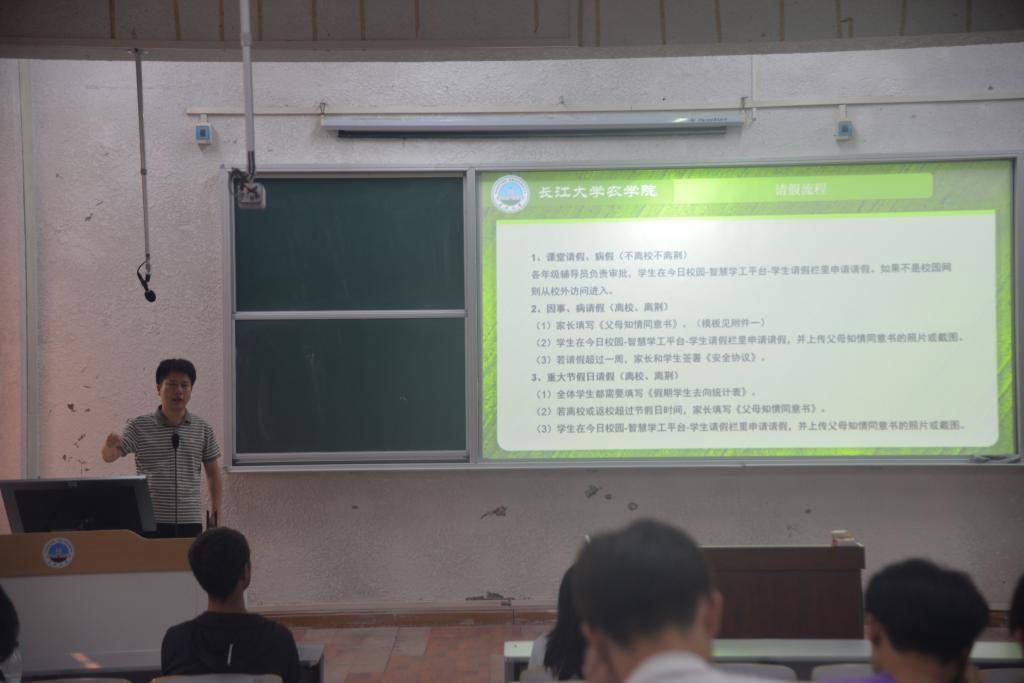 接着,黄老师向同学们提出学业规划同样不容忽视,提醒同学们做好学业课程、实习实训的规划,为未来的职业发展奠定坚实基础。由于国庆假期将至,辅导员黄承石老师还对请假离校流程进行了解读,明确了请假的规范和要求,以此来保障员工的安全和正常的教学秩序。