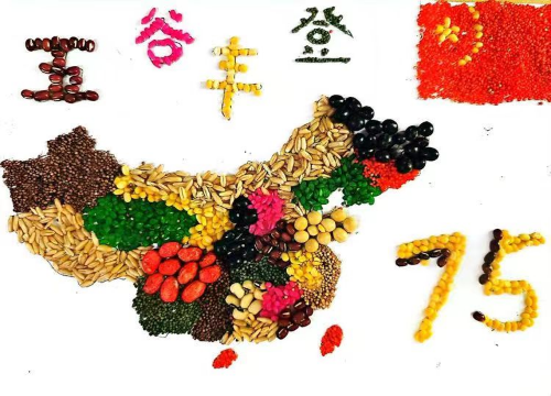 其中作品《神州葳蕤》由黑豆,红米等拼贴,中心是中国地图,上方是“五谷丰登”字样,右上方是中国国旗,右下方是数字“75”。该作品表明,七十五载春华秋实,我国农业展现五谷丰登的收获景象。农业的辉煌发展寓意着国家稳固,经济发展,人民幸福。生长在如此富足的时代,我们更应心存感恩,热爱祖国.