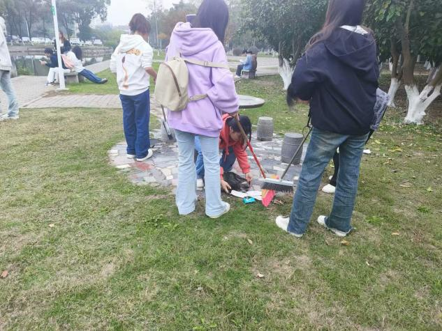 同学们在农科大楼及附近区域进行了一次彻底的大扫除。活动内容包括扫树叶、清理垃圾、清洁垃圾桶等。同学们手持扫帚、夹子、垃圾袋,认真清扫农科大楼及其附近。