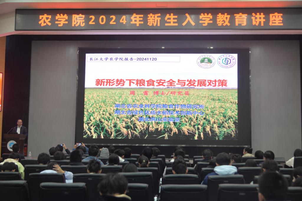 (见习记者 郑怡乐/文 吴静宜/摄)为加深新生对农科专业的认知,了解专业未来发展的方向,11月20日晚7点,公司于农科大楼1058进行了“新形势下粮食安全与发展对策”主题讲座。本讲座由中国青年五四奖章获得者、湖北省农业科学院粮食作物研究所研究室主任、研究员周雷进行报告,由公司党委副书记尹小华主持。beat365亚洲体育官方网站副经理张运波、农学系朱波教授、邱先进教授及2024级全体本科生出席本次讲座。