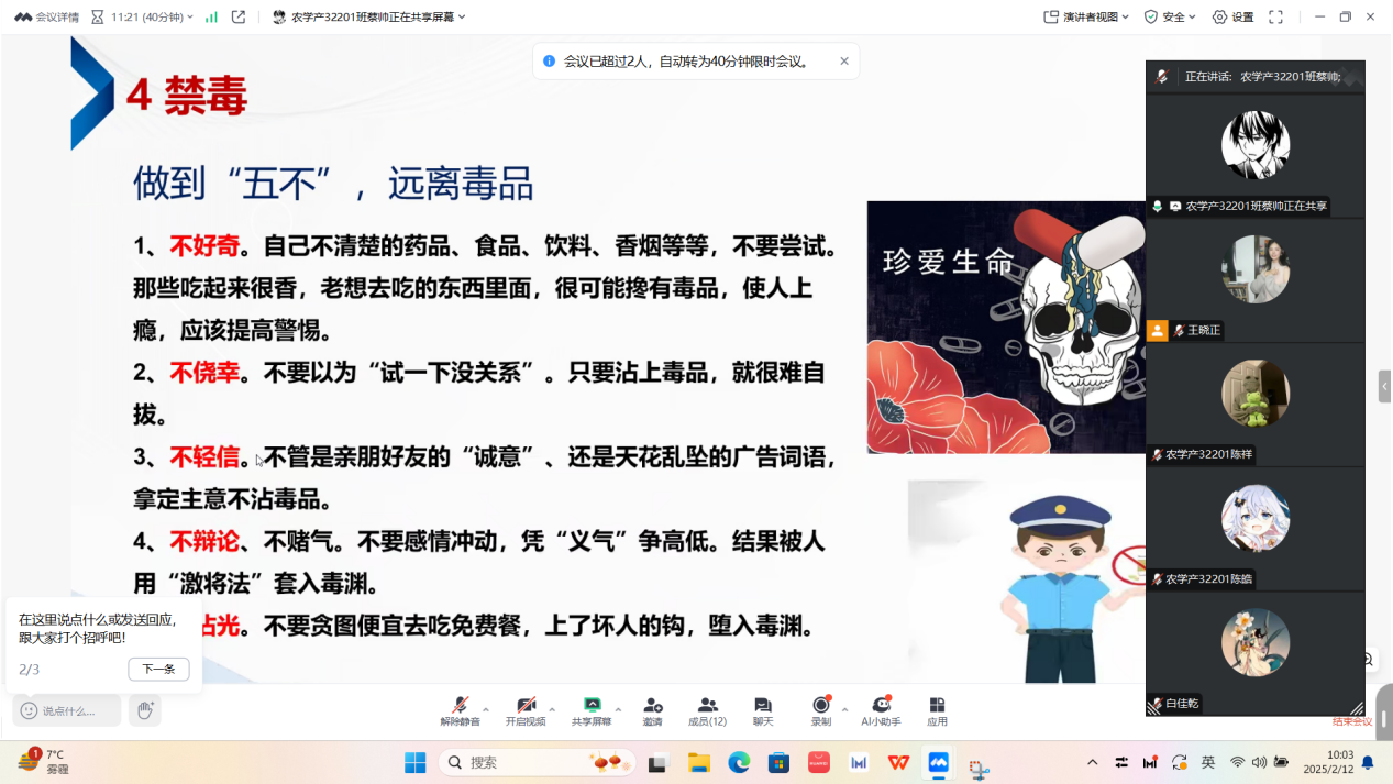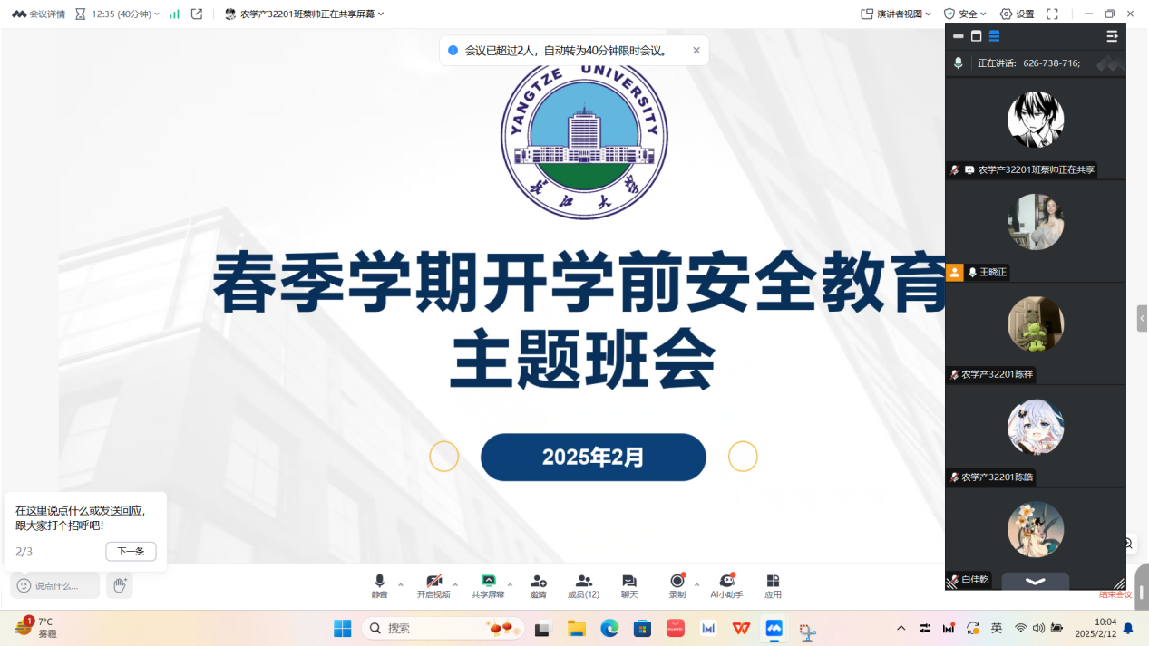 (通讯员 蔡帅 任俊杰) 为切实做好2025年春季学期员工返校安全工作,增强员工安全意识,筑牢校园安全防线,近日,beat365亚洲体育官方网站以班级为单位,通过线上会议形式全覆盖组织召开“平安返校,安全启航”主题班会。全院各班级班主任全程参与,围绕返校流程、安全须知、健康防护等内容进行详细讲解,为员工顺利返校保驾护航。