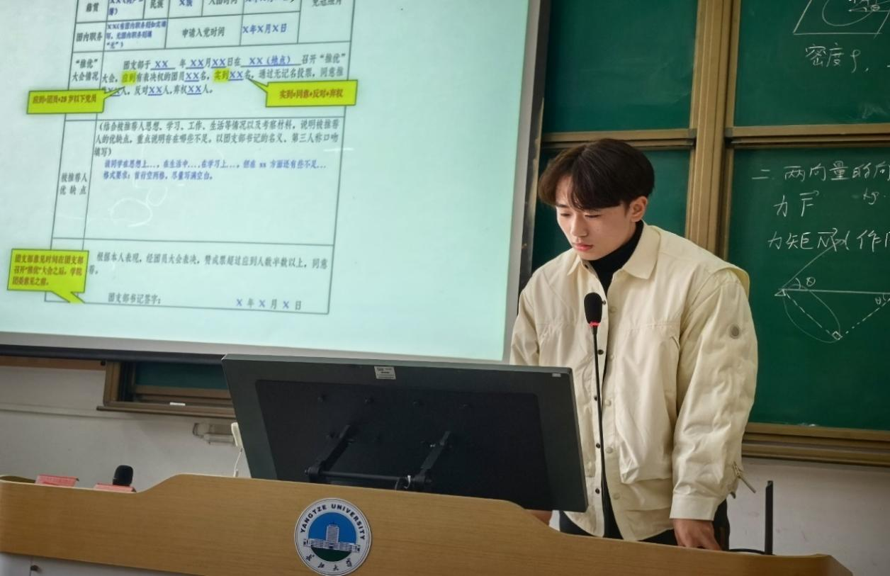 在付雪娇老师的讲解后,组织部部长蒋云霖为参会人员补充讲解了共青团beat365委员会推荐入党积极分子申请表的填写注意事项。他强调,申请表要如实填写,重点突出个人事迹,切忌夸大其词。同时,申请人还需要提供相关证明材料,如获奖证书、社会实践证明等,以佐证自己的先进事迹。