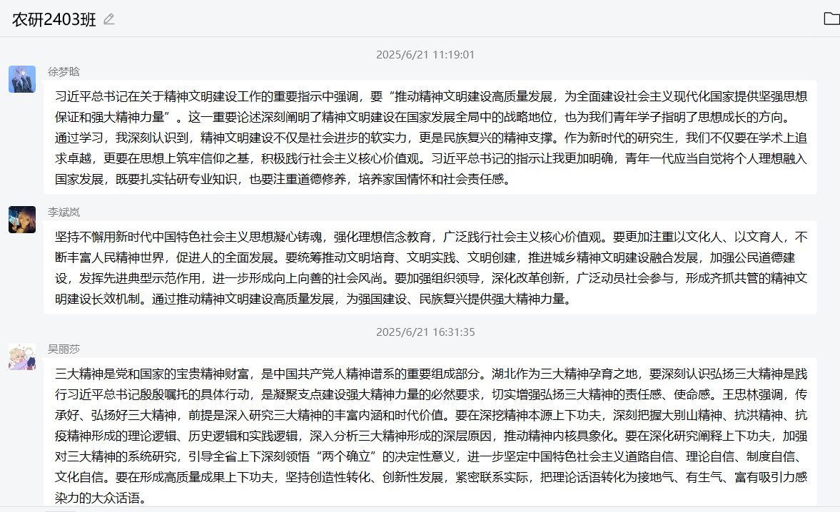 活动中,同学们深入学习习近平总书记在河南考察时的重要讲话精神,深刻领会“坚定信心推动高质量发展,奋力谱写中原大地推进中国式现代化新篇章”的战略要求。结合习近平总书记关于党的纪律建设的重要论述,同学们系统学习了社会主义精神文明建设的根本遵循,深刻认识到精神文明建设对科研创新与人才培养的引领作用。通过研读《习近平致复旦大学建校120周年的贺信》,同学们深切感受到党和国家对高等教育事业的高度重视与殷切期望。贺信中提出的“推动科技自主创新”“用社会主义思想铸魂育人”等要求,引发了同学们对自身责任的深入思考。学习活动还特别结合弘扬大别山精神、抗洪精神、抗疫精神专题内容,通过案例分享、主题研讨等形式,激励同学们传承红色基因,赓续精神血脉。