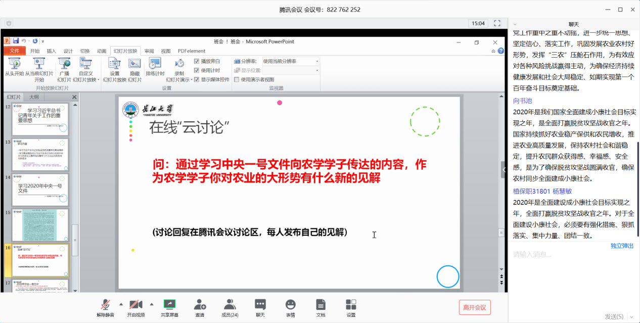 植保职31801班班长杨姝祺同学首先带领全体同学对“2020年中央一号文件”进行了细致深入的学习。随后,杨姝祺同学向大家提出“通过学习中央一号文件向农学学子传达的内容,作为农学学子你对农业的大形势有什么新的见解”的问题,全班同学随即在线进行了“云讨论”。会上,同学们回答激烈2020年中央一号文件的基础上,做了对农业的新型展望。韩晓文同学表示,今明两年是全面建成小康社会的决胜期,“三农”领域有不少必须完成的硬任务。党中央认为,在经济下行压力加大、外部环境发生深刻变化的复杂形势下,做好“三农”工作具有特殊重要性。