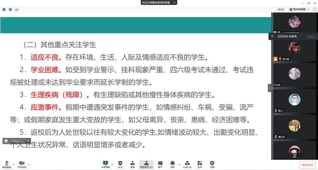 会议开始,各年级辅导员就近期要开展的主要工作进行了介绍,主要涉及员工开学工作安排、返校后的教育管理、员工心理危机预警排查、员工心理教育、安全教育、就业工作、寝室文明卫生建设、学风建设等工作。