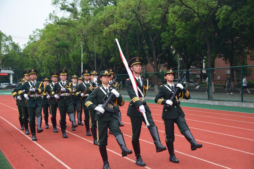 七点整,升旗仪式在振奋身心的国歌中拉开帷幕,五星红旗迎着朝阳缓缓升起,全体师生行注目礼,共唱国歌。