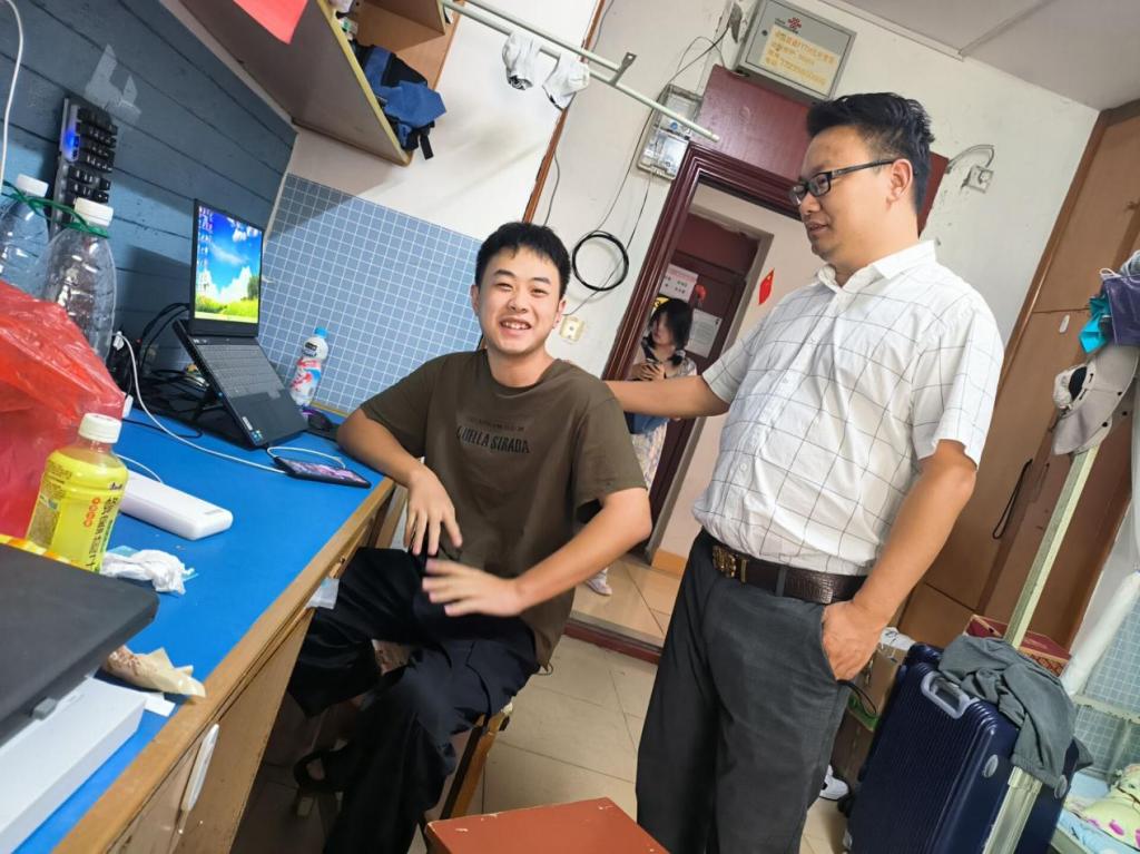 在大四员工的寝室,辅导员侯聪详细询问了他们的未来规划,与同学们深入探讨了有关于学业规划、就业准备等话题。给他们提供了一些建议和指导,帮助同学们更好地规划未来。