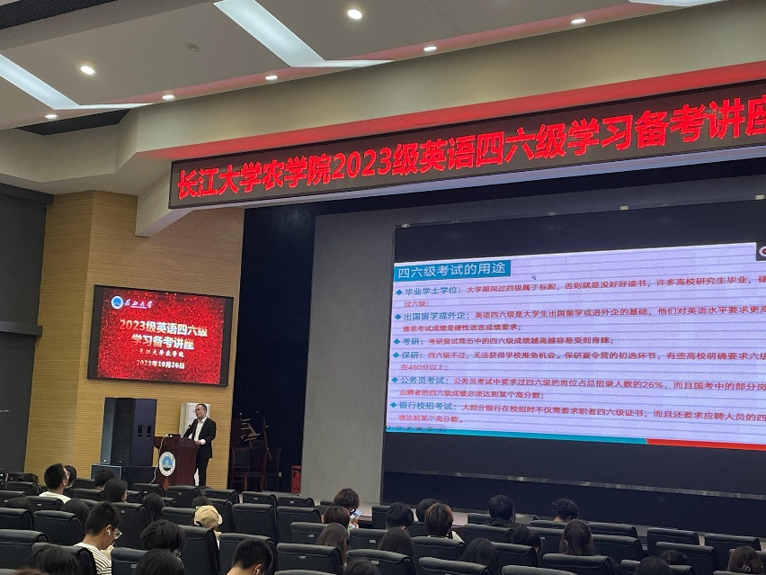 (通讯员 王静茹)为认真做好考试工作,创建优良学风、考风,公司于10月26日下午在农科大楼1058召开2023级英语四六级学习备考讲座,23级全体同学及20-22级部分同学参加。本次讲座邀请到胡凯老师主讲,由辅导员唐玉婷主持。