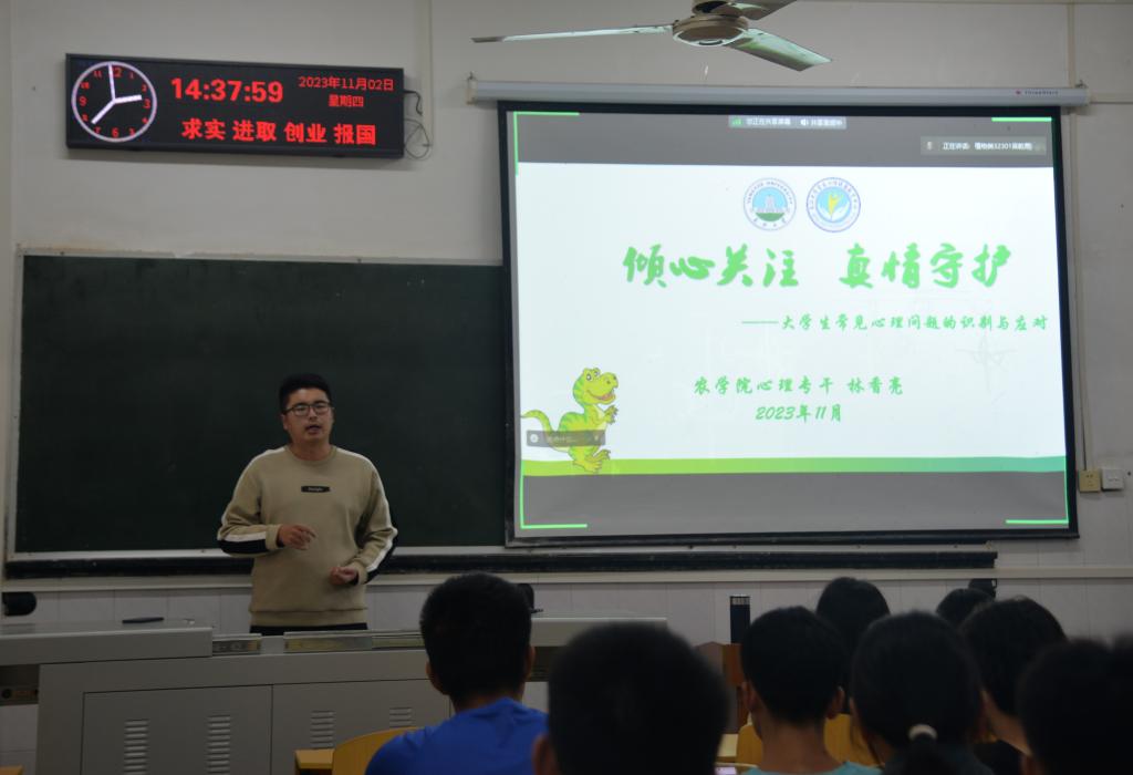 beat365亚洲体育官方网站心理专干林香亮从老员工的身心特点和老员工心理健康的评判标准两方面进行介绍,引导员工骨干正确认识心理危机的防范、识别与干预。他通过讲述自助与助人方法,增加了同学们心理危机干预的知识和技能,帮助同学们在生活中正确自助与助人。