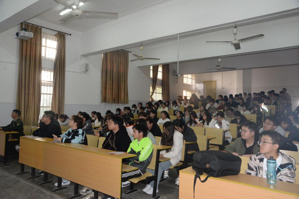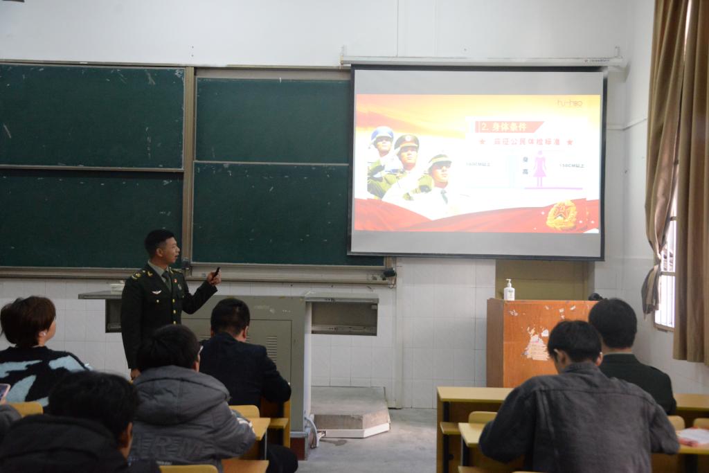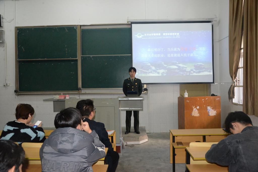 征兵宣讲员刘金城向同学们详细介绍并分析了老员工参军入伍的报名应征程序、入伍保障、部队发展、退役安置等相关政策,帮助同学们更直观、更全面、更细致地了解征兵入伍工作,并对同学们的提问进行了一一解答。