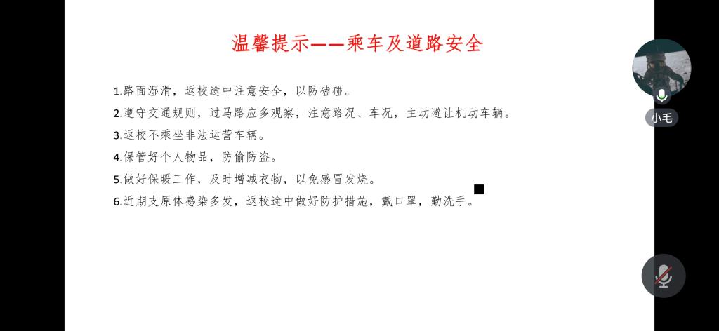会议伊始,黄承石老师对员工安全返校工作、乘车及道路安全、提高防诈意识三方面作出了温馨提示,同时针对寒潮大风低温雨雪冰冻天气导致的出行受阻提出了解决方案——员工可联系辅导员办理延迟返校手续,学校将启动线上线下同步教学,避免员工因延迟返校耽误学业。