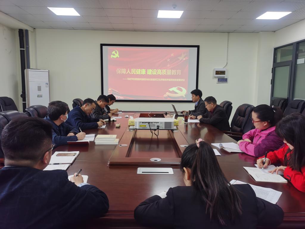 会议伊始,学工办主任刘庆以“保障人民健康 建设高质量教育”为主题,从新时代女性风采、新中国历史上极不平凡的一年、把保障人民健康放在优先发展的战略位置、着力构建优质均衡的基本公共教育服务体系等四个方面带领大家学习了习近平在看望参加政协会议的医药卫生界教育界委员时的重要讲话。