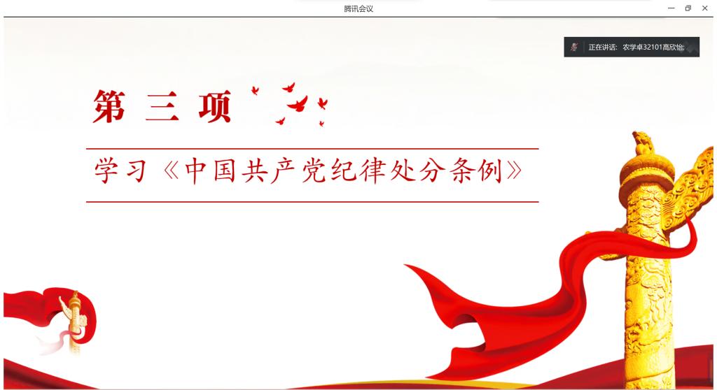 会议伊始,高欣怡带领全体党员重温入党誓词,并对本月党费交纳情况进行说明,全体党员共同学习《中国共产党纪律处分条例》的相关内容。随后,李慧明给全体党员讲授微党课,带大家深入学习习近平总书记关于党的纪律建设重要论述。