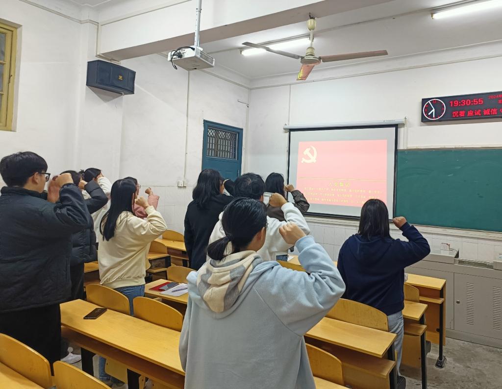 会议伊始,江雪同志带领全体党员重温入党誓词,高欣怡同志对本月党费交纳情况进行说明,全体党员诵读《中国共产党章程》第一章相关内容。